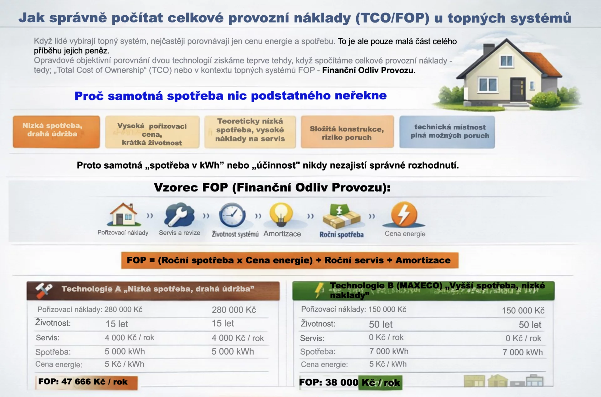 A přesně proto vznikla FOP kalkulačka, kterou MAXECO připravuje – aby každý mohl jednoduše porovnat jakýkoliv topný systém i s technologií MAXECO.